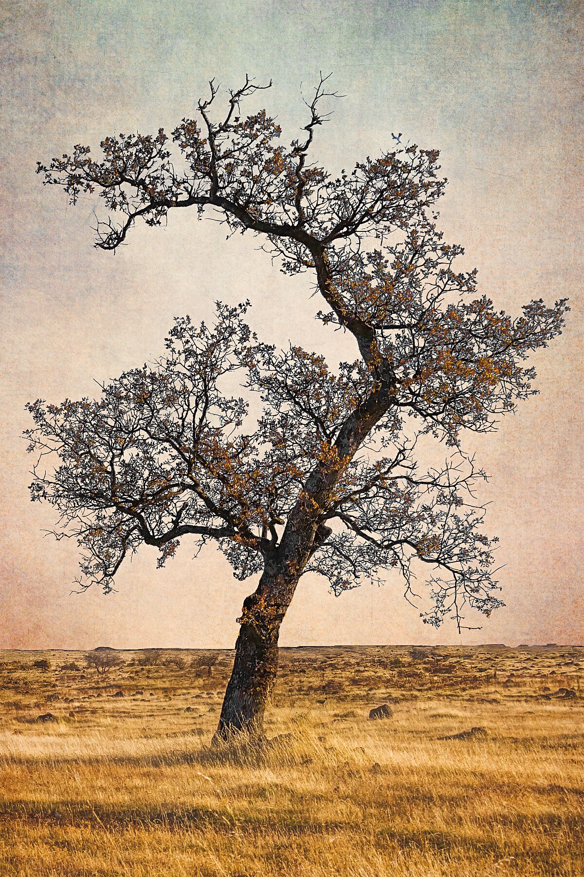 Blue Oak One leans with quiet elegance, as if caught mid-dance in the wind. Its expressive posture and gently weathered leaves convey movement, balance, and strength that have been shaped over time. The artist enhances this natural gesture with softly muted textures and golden light, creating an atmosphere that feels both grounded and lyrical.