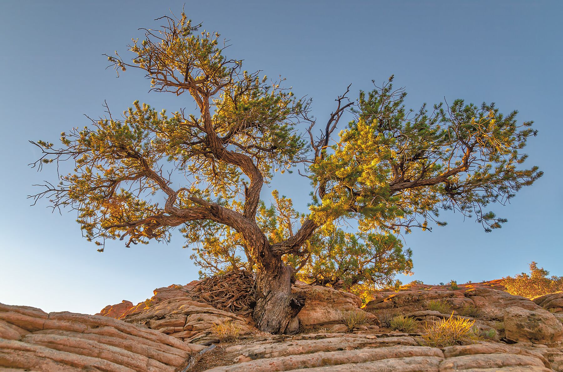 Rooted deep in sculpted sandstone, this pine rises with quiet resilience. Its textured limbs, like waves—cut by time, wind, and water— stretch skyward, while golden light catches the tree in a moment of radiant stillness. In The Standing Ones, Deirdre explores how trees not only survive in difficult places but shape the emotion of the landscape itself.