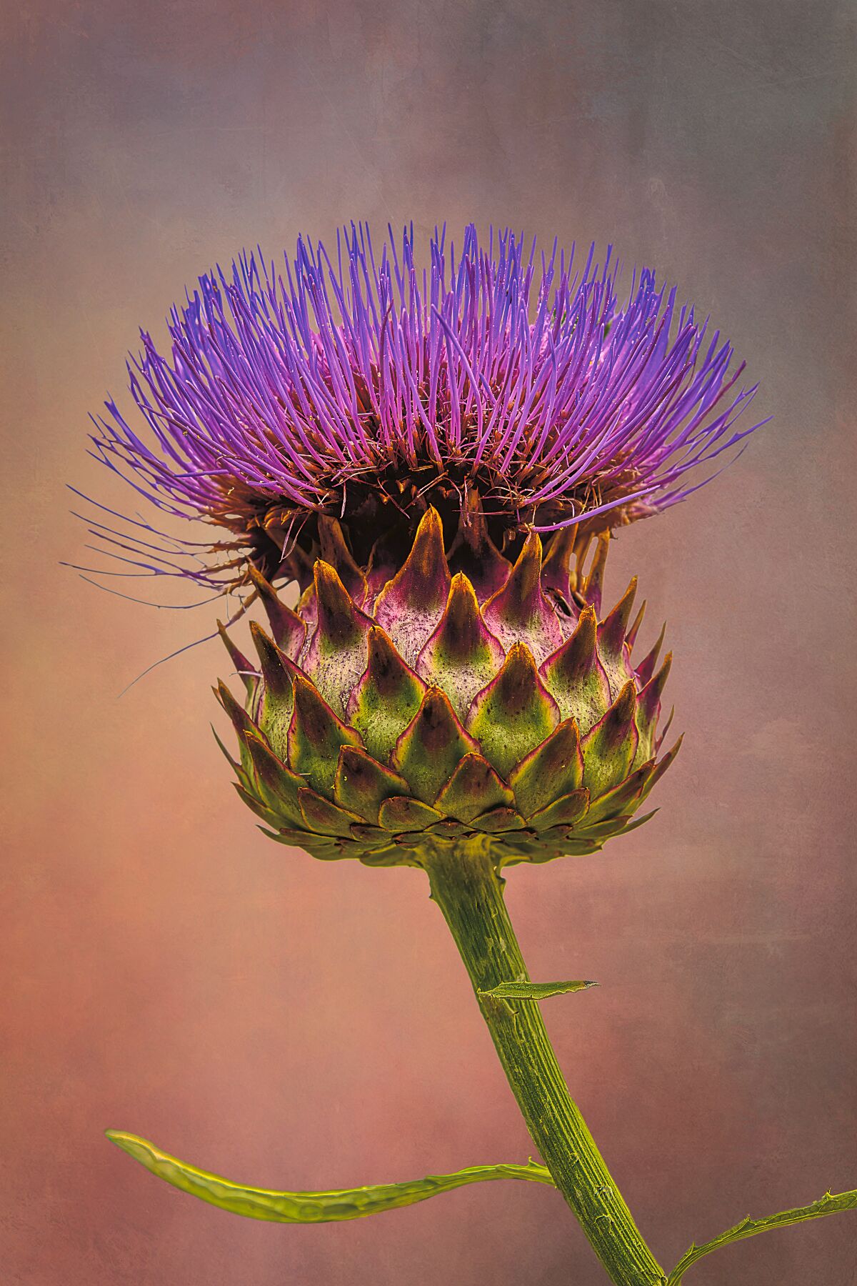 Standing tall and steadfast, the thistle wears its crown of violet with quiet pride. Its armor of green bracts tells a story of resilience, while the delicate burst of color above speaks of beauty found in unlikely places. Simple, striking, and noble in form, this bloom reminds us that even the rugged can blossom into grace.