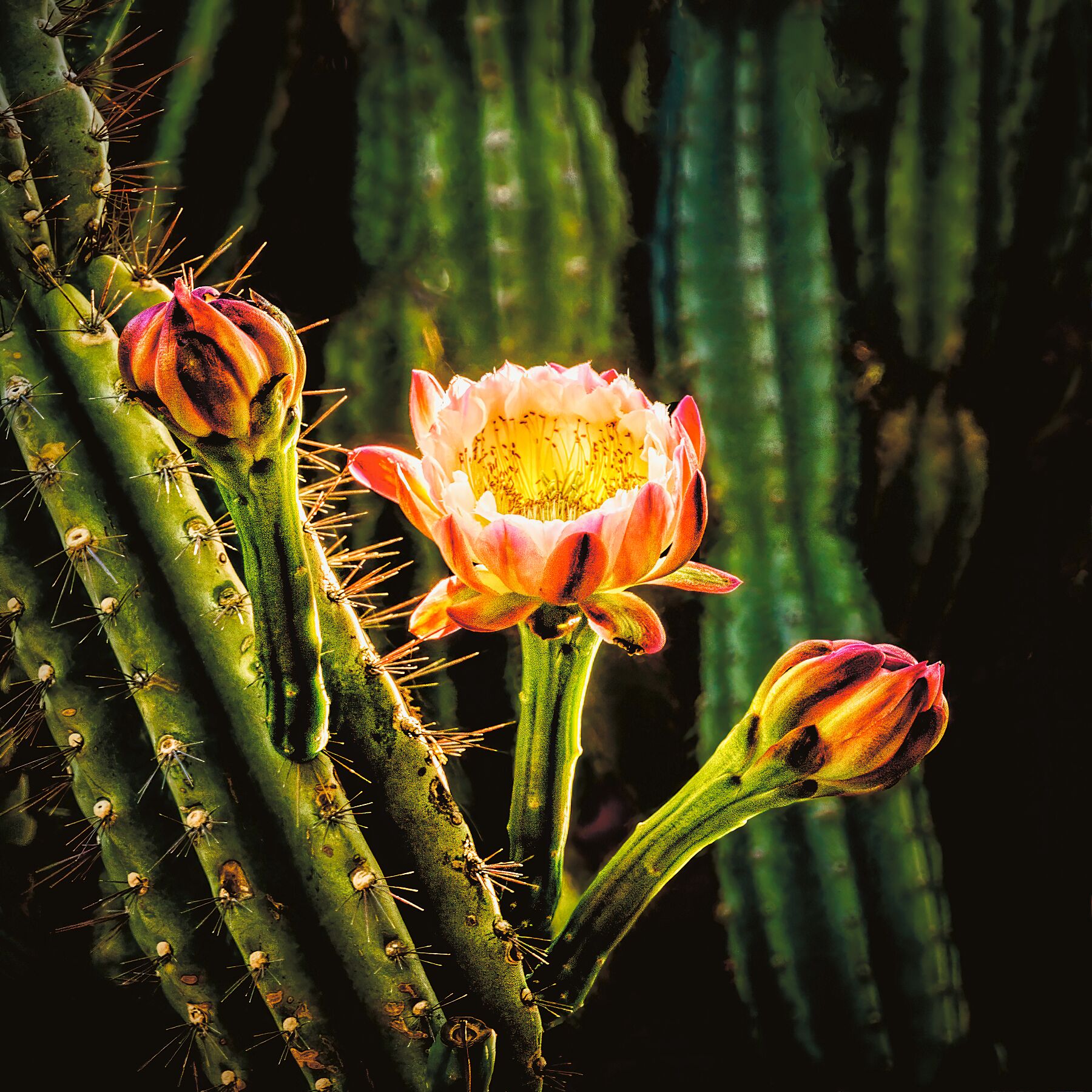 Amid towering spires of cactus, a single blossom rises into brilliance. The flower, its petals edged with coral and flushed with gold, opens like a flame against the cool vertical shadows of green. It is a moment of fleeting beauty—the desert’s quiet miracle—captured just as the bloom stretches wide, revealing its radiant heart before time and heat reclaim it. The cactus, armored in spines and years, becomes the steadfast stage upon which this fragile bloom performs its brief, luminous act.