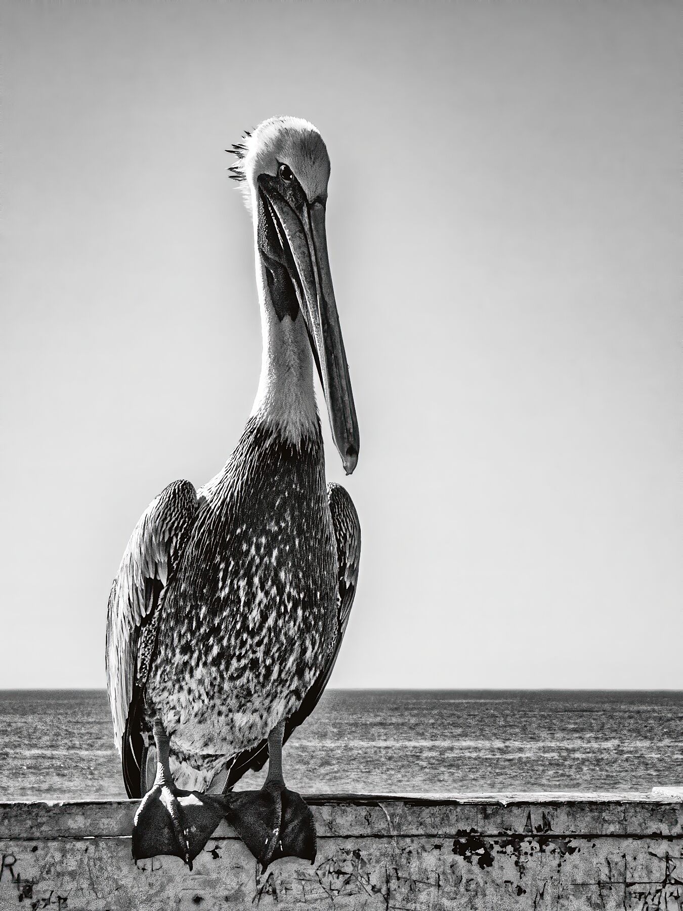 A portrait of patience and quiet authority, Pier Sentinel captures a lone pelican poised against the endless horizon of sea and sky. Rendered in stark black and white, every feather becomes texture, every line of its stance an echo of nature’s perfection. The bird’s steady gaze suggests both wisdom and watchfulness, while the soft gradient of the background draws our attention to its commanding form. This image balances the natural dignity of the pelican with the timeless stillness of the ocean.