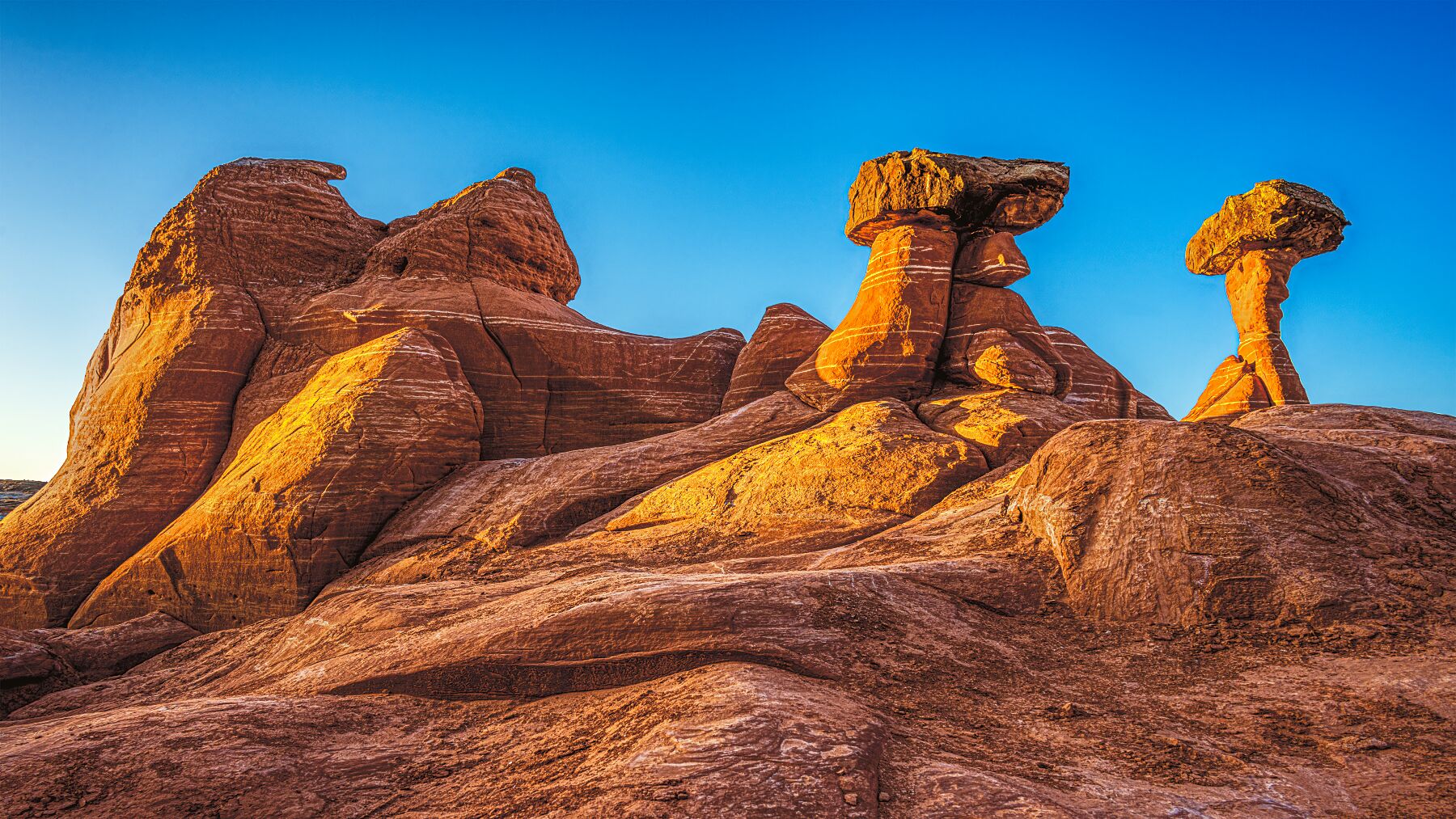 Rising from the desert floor of the Grand Staircase–Escalante, the Toadstools seem almost impossible—slender columns crowned with massive stone caps, balanced as if by sleight of hand. Shaped by centuries of wind and rain, they stand as sculptures of time itself, both playful and commanding. Their warm sandstone hues deepen into fire during sunrise, revealing nature’s ability to surprise us with elegance, balance, and just a touch of whimsy.