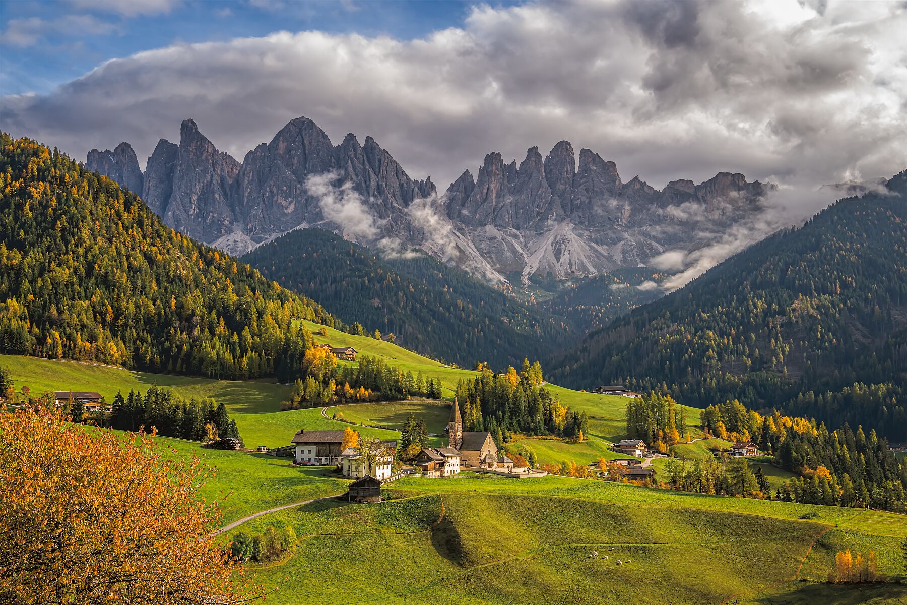 Beneath the jagged guardians of the Dolomites, a quiet valley unfolds in a tapestry of green and gold. The village rests as if time moves slower here, its church spire pointing faithfully toward the shifting heavens. Autumn trees scatter their color along the slopes, catching the last warm light before evening descends. In this archival print, Deirdre finds the poetry of stillness, and the grace of a place.