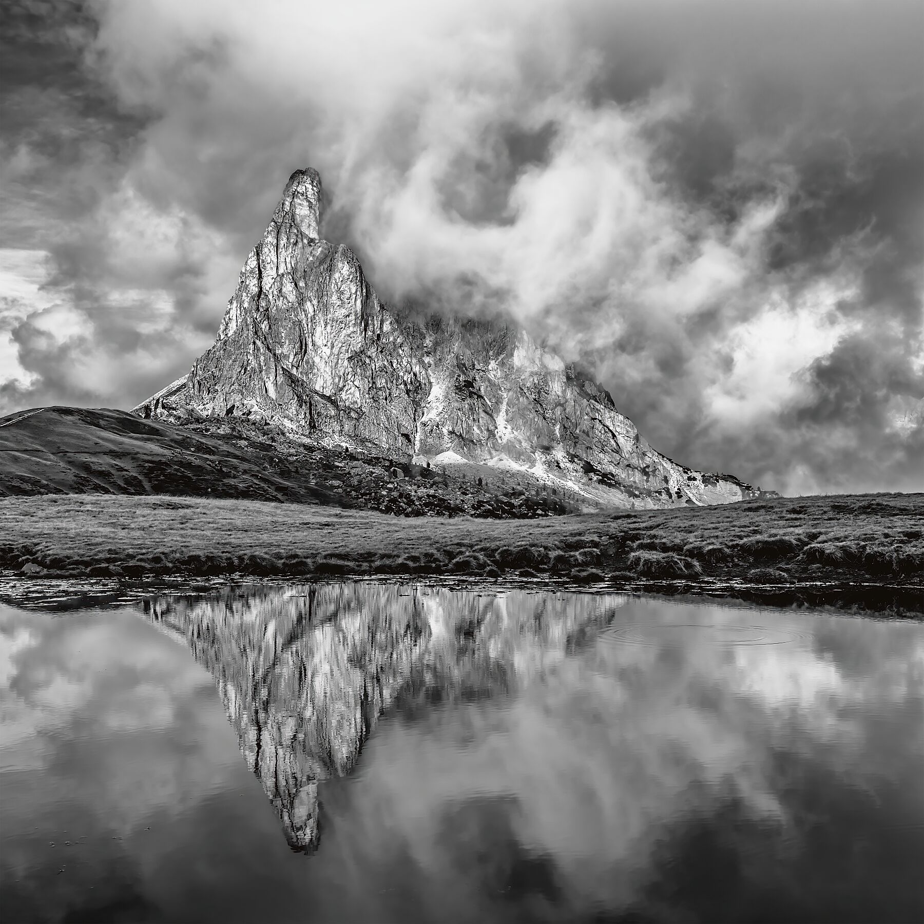 In the purity of monochrome, the mountain becomes a study in light and shadow. Clouds coil around its sharp pinnacle, softening the stone while revealing every fracture and fold. Without the distraction of color, the textures speak more clearly—the weather-worn ridges, the shifting veils of mist, the glass calm surface below. Deirdre uses black and white to distill the Dolomites to their essence: form, contrast, and the timeless interplay between permanence and change.